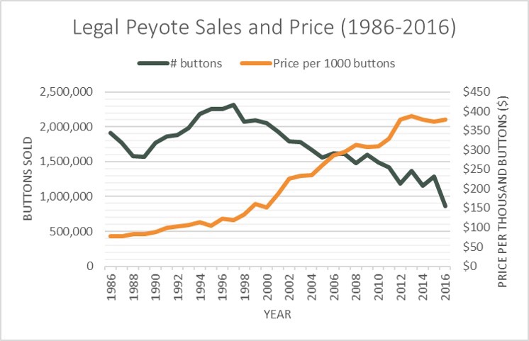 First, a reminder that the scarcer peyote becomes, the average size of plants harvested decreases as well. A single mature peyote plant of proper harvesting size weighs many times as much as a smaller button. And yet the price is the same for a small sack of 1000 harvested plants as that of a large, heavy, sack of larger, mature medicine. So what this means is that plants harvested in natural culture of a mature size equal the same mass as several smaller plants. So the basic point here is that less equals more. But this conservation advantage does not come into play unless only mature plants are taken.