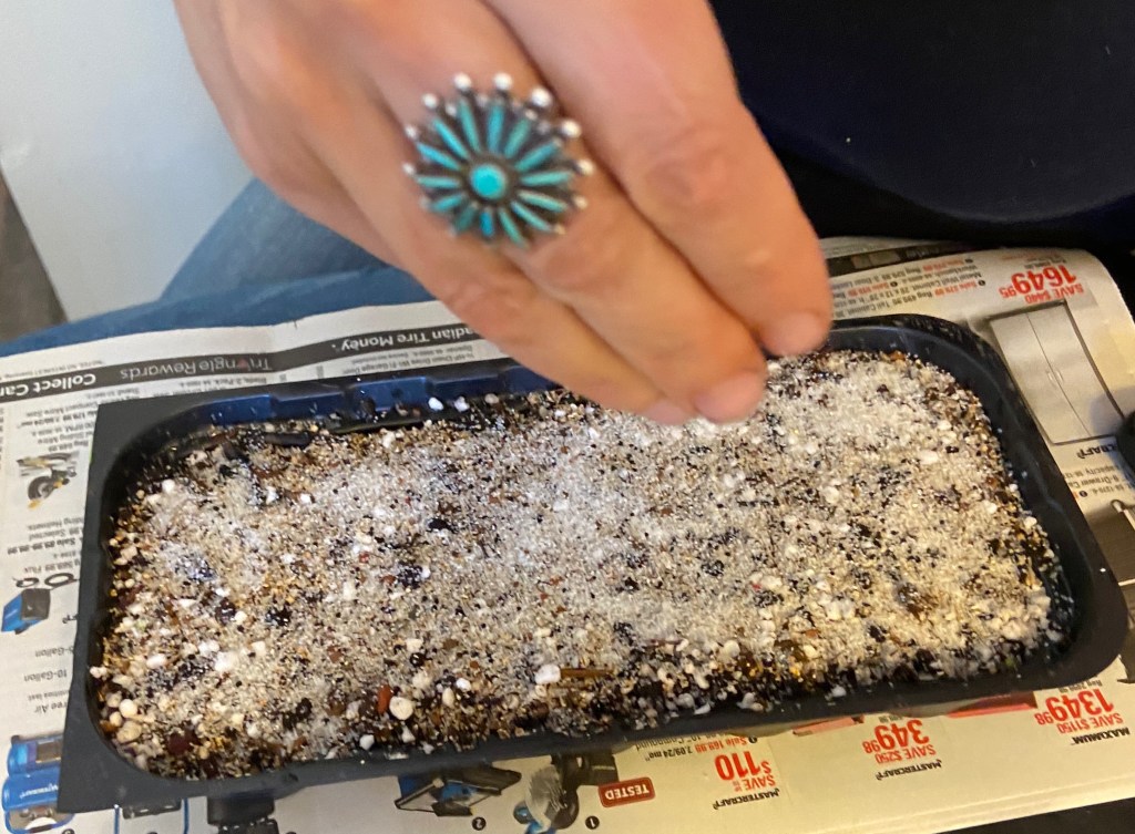 Next, a thin layer of crushed quartz or clear sand is sprinkled over the seeds. This allows light to stimulate germination while also providing a mulch layer for moisture retention and seedling stability.