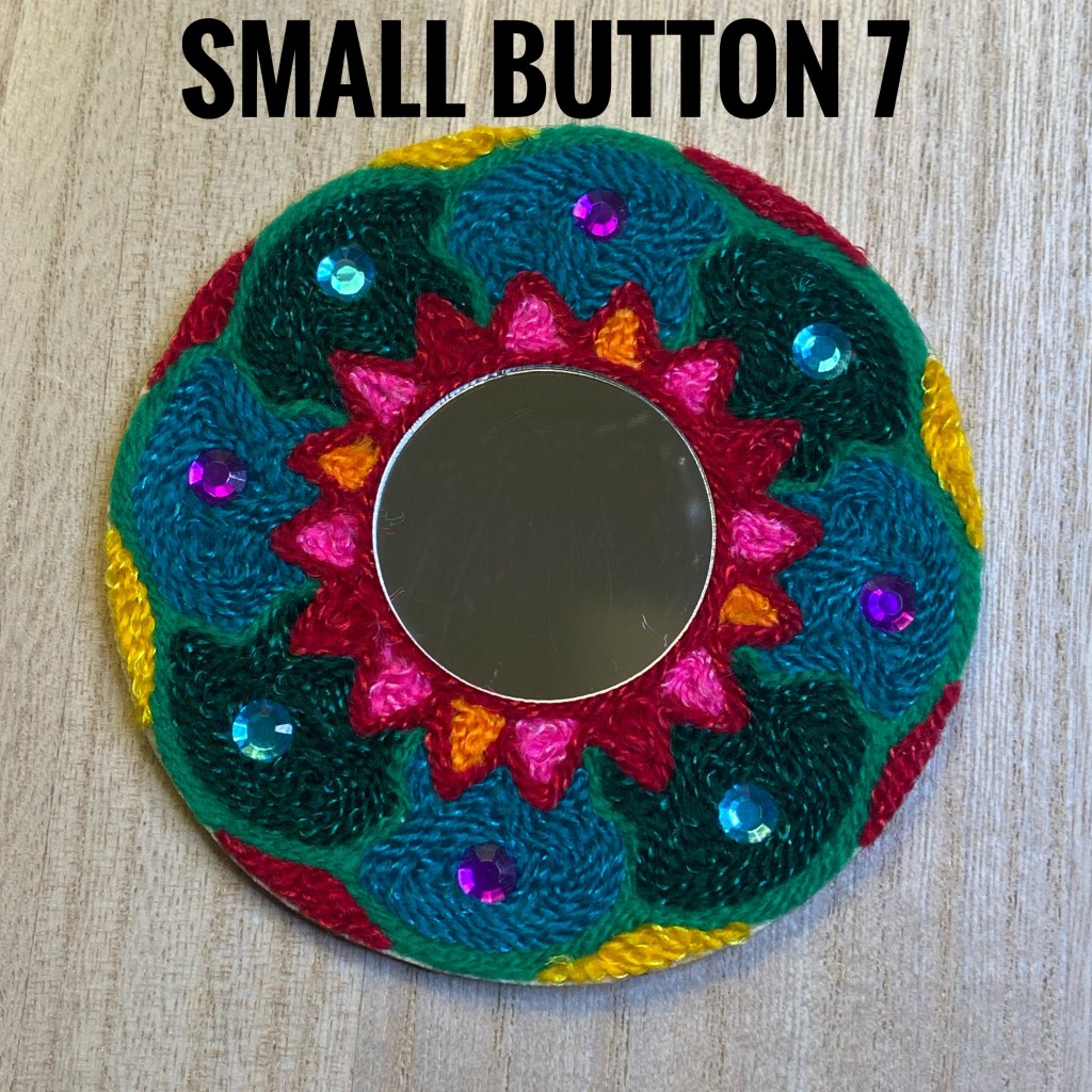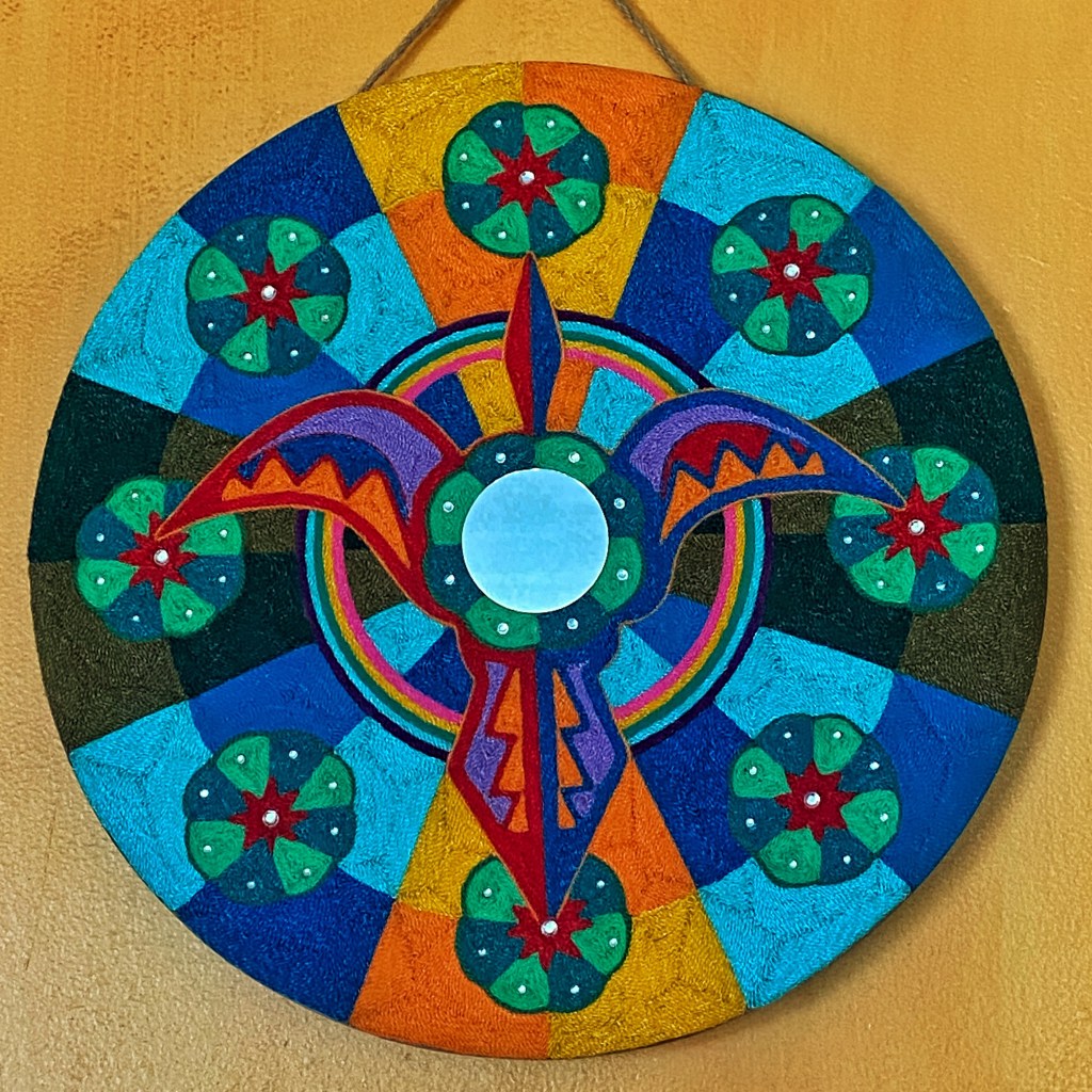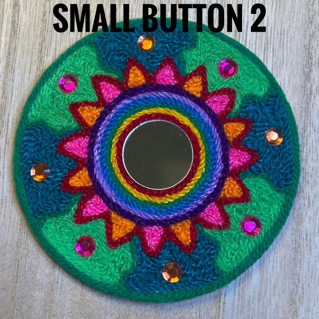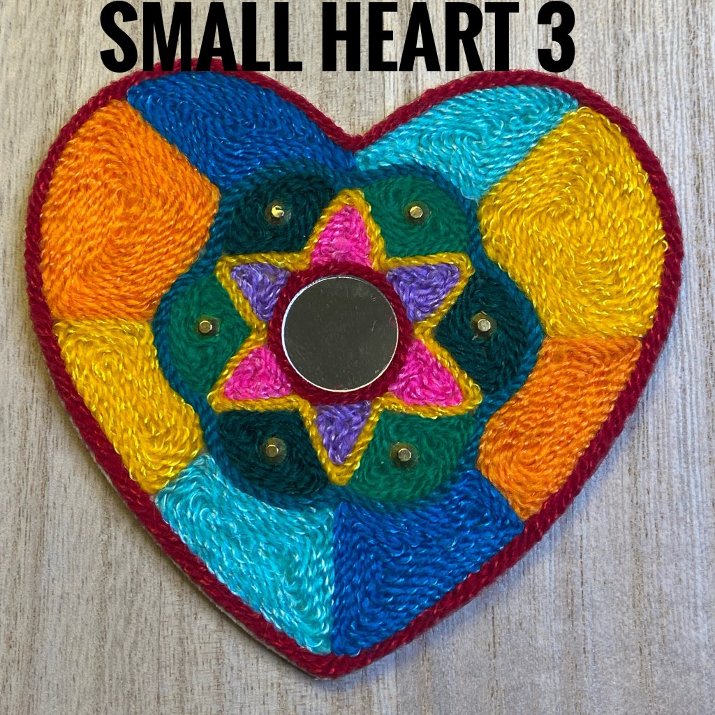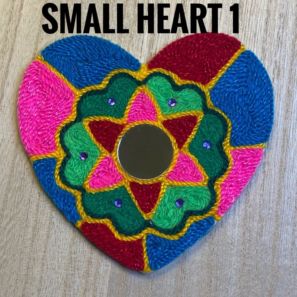I created these with traditional string, mirrors, semi precious stone cabochons, and acrylic sparkly pieces on beeswaxed wood. Many hours and good thoughts are invested into each piece.