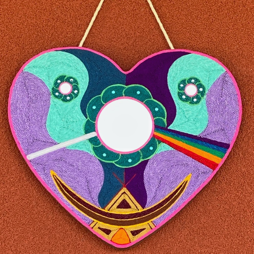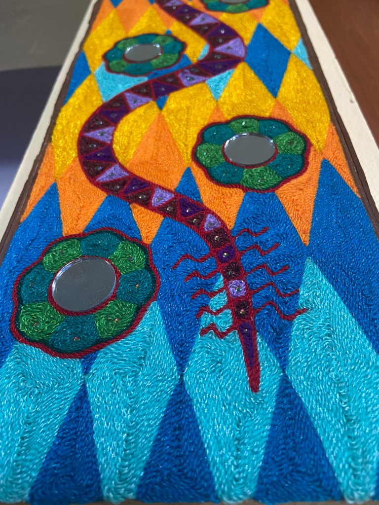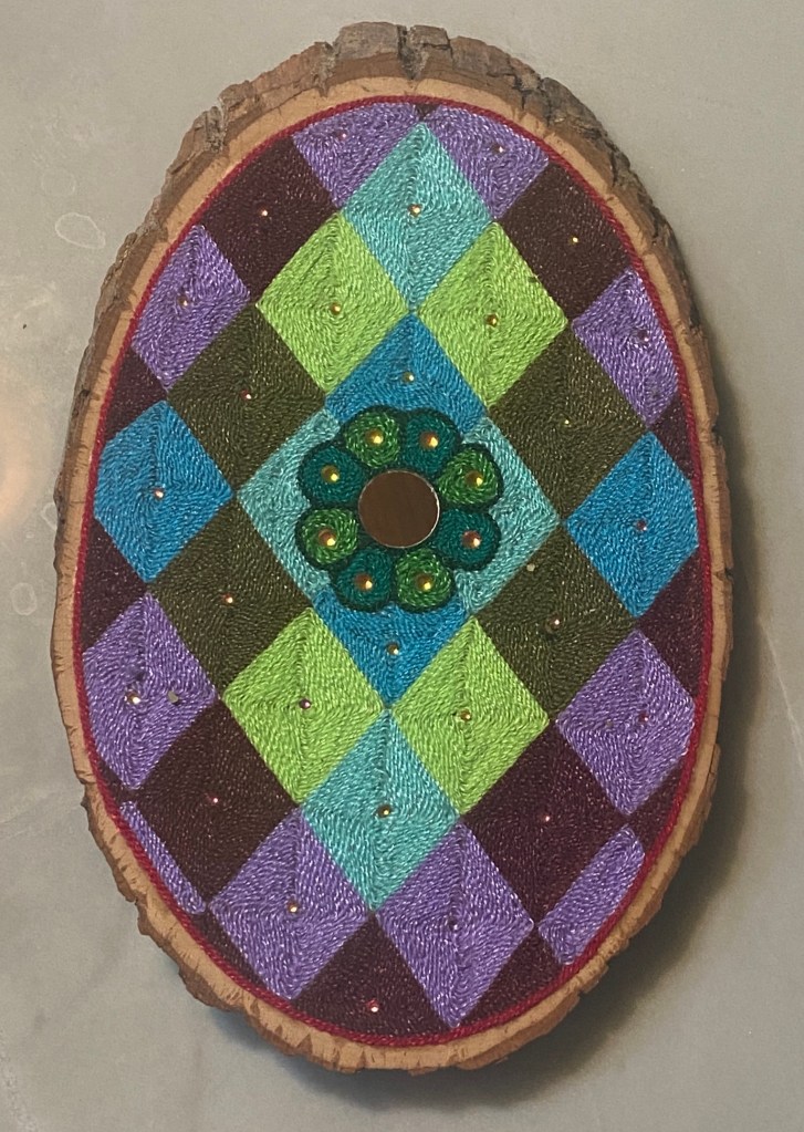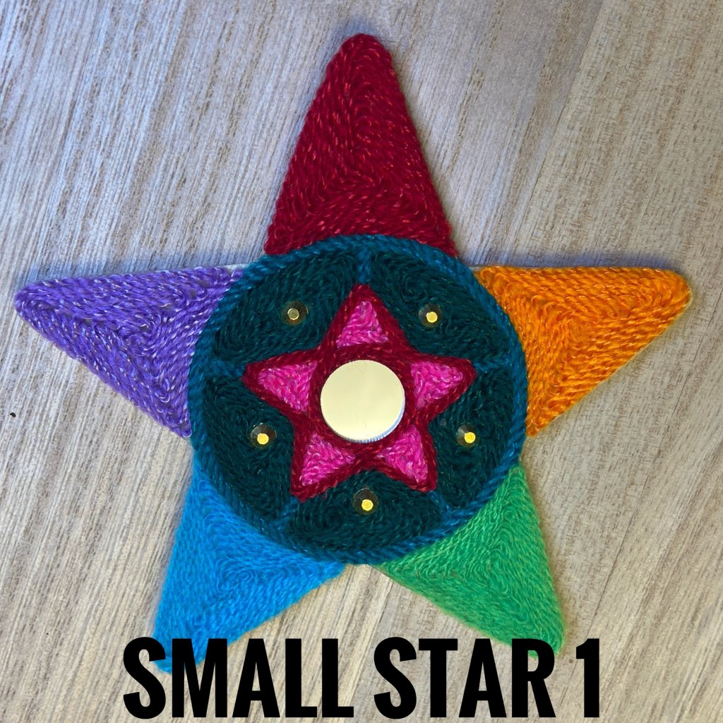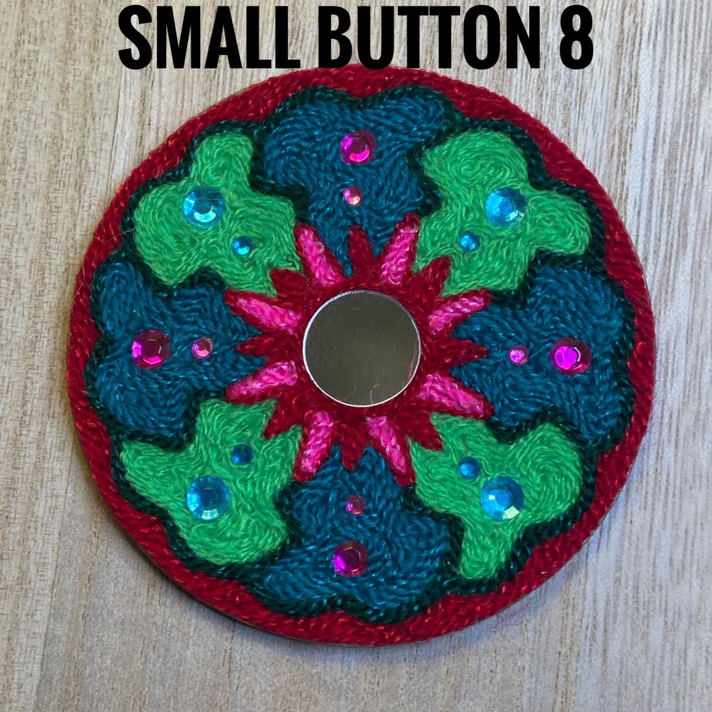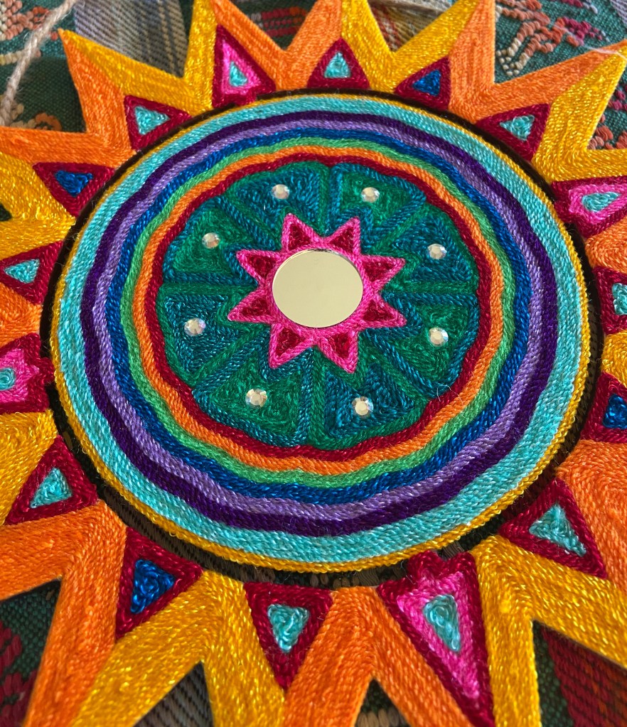 I created these with traditional string, mirrors, semi precious stone cabochons, and acrylic sparkly pieces on beeswaxed wood. Many hours and good thoughts are invested into each piece.